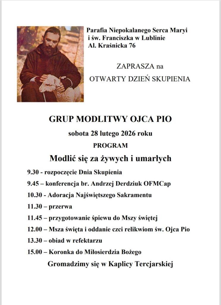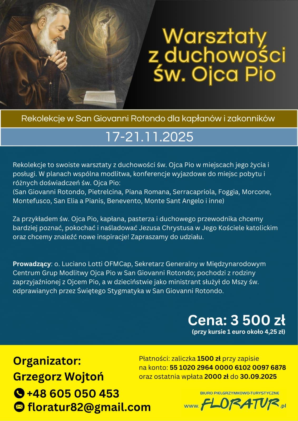 Serdecznie zapraszam Was na: Ogólnopolskie Czuwanie GMOP w Sanktuarium Bożego Miłosierdzia w Krakowie Łagiewnikach (20 VI 2026), Kongres Animatorów i Moderatorów GMOP w Tenczynie (11-13 IX 2026), Kongres Animatorów i Moderatorów GMOP w Gdańsku (dla północnej części Polski, 10 X 2026), Czuwanie GMOP na Przeprośnej Górce i w Częstochowie (26/27 IX 2026), Czuwanie GMOP w Sanktuarium św. Ojca Pio w Warszawie Gocławiu (16 V 2026), Spotkanie kapłanów opiekunów GMOP w Częstochowie (9 IX 2026), Rekolekcje ze św. Ojcem Pio dla kapłanów i zakonników w Tenczynie (14-17 IX 2026), Rekolekcje ze św. Ojcem Pio w Tenczynie (6-8 XI 2026), Czuwanie GMOP w Sanktuarium św. Ojca Pio w Terliczce (13/14 XI 2026).