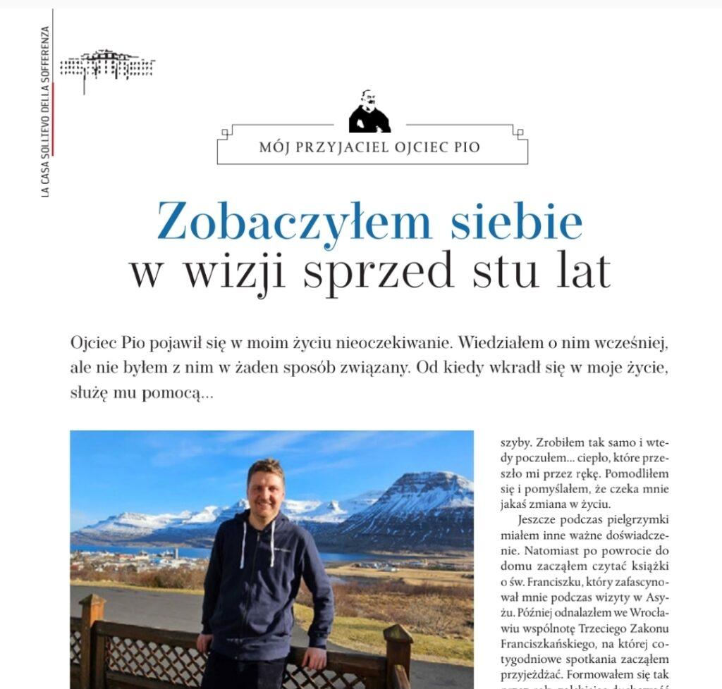 Ciepłe wezwanie W lipcu 2016 roku pojawiła się okazja wyjazdu na pielgrzymkę do Włoch z bogatym programem, który obejmował niemalże wszystkie najważniejsze miejsca kultu religijnego. Pojechałem na nią bez większych oczekiwań. Podczas zbliżania się do San Giovanni Rotondo ksiądz zaczął opowiadać o cudach, jakie tam się dzieją, między innymi o tym, że ludzie przybywający do grobu Ojca Pio czują swoiste ciepło. Upewniłem się o tym już chwilę później, podczas zwiedzania. Przy sarkofagu z ciałem Ojca Pio tłoczyli się ludzie, wystawiali ręce i dotykali osłaniającej go szyby. Zrobiłem tak samo i wtedy poczułem… ciepło, które przeszło mi przez rękę. Pomodliłem się i pomyślałem, że czeka mnie jakaś zmiana w życiu…