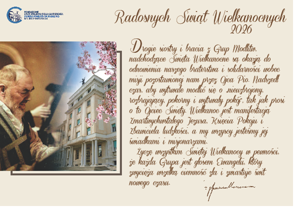 Drodzy! Dziękuję Wam za tworzenie Grup Modlitwy Ojca Pio i zaangażowanie w ich duchowy oraz liczebny rozwój. Niech Pan Jezus Chrystus błogosławi czas 2026 roku, nasze życie i posługę, nasze Grupy Modlitwy Ojca Pio i bliskich!