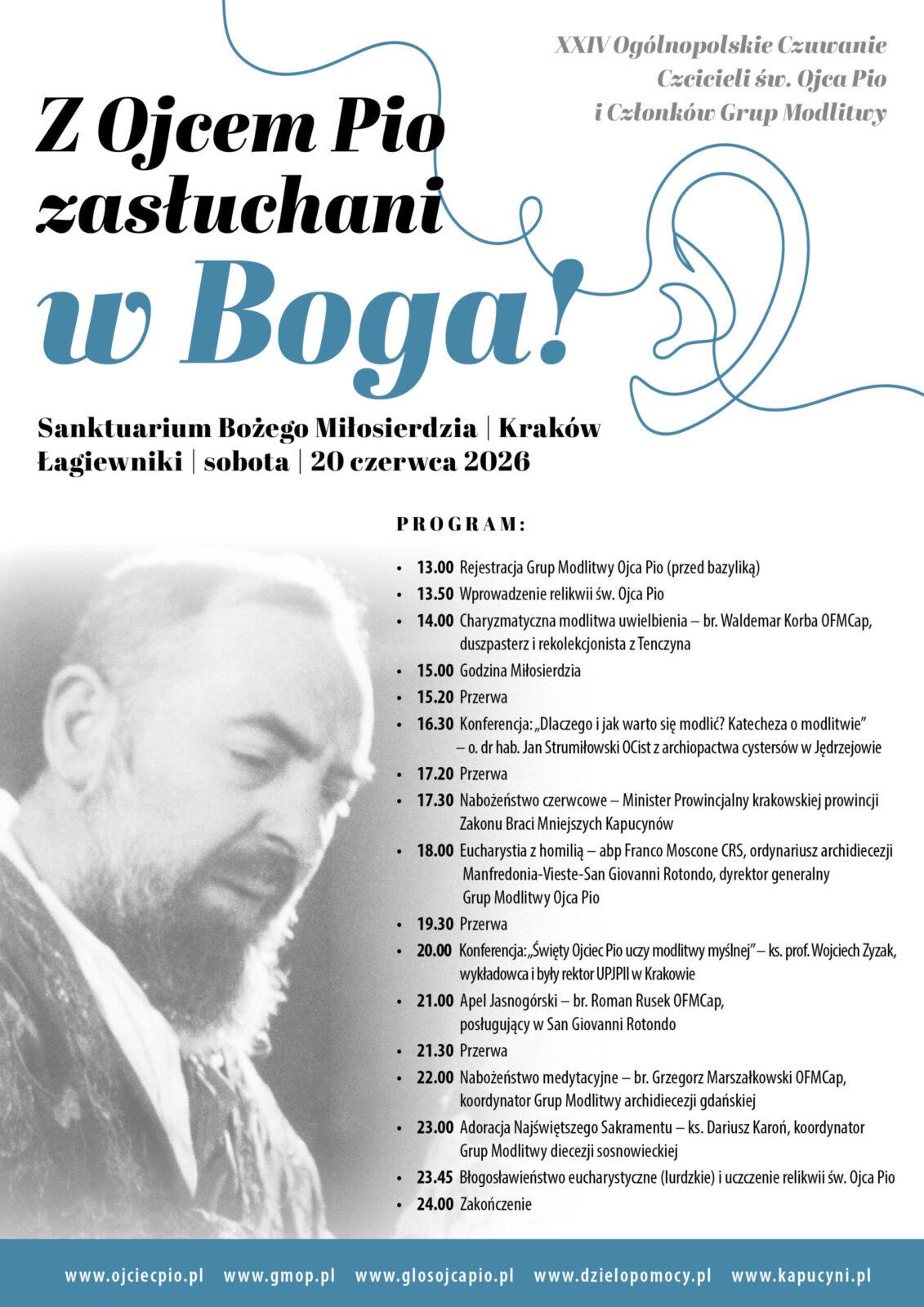 Godzina (dla) Jezusa Adoracja Jezusa Eucharystycznego 1 godzina tygodniowo przez 7 lat (od 1 I 2026 do 1 I 2033) W ramach duchowego przygotowania do Wielkiego Jubileuszu 2000 lat Odkupienia Jezusa Chrystusa, który odbędzie się w 2033 roku, zapraszamy do udziału w siedmioletniej cotygodniowej godzinnej adoracji wszystkich chętnych wraz z Grupami Modlitwy Ojca Pio. W wybranym przez siebie dniu tygodnia chcemy:- wielbić Pana Boga,- zadośćuczynić za grzechy,- modlić się w intencjach Kościoła i jego pasterzy,- prosić o liczne i święte powołania kapłańskie, zakonne, misyjne,- powierzać Stwórcy losy naszej Ojczyzny: dzieci, młodzież, rodziny, rządzących,- błagać o pokój na świecie… Zgłoszenia i zapisy osób indywidualnych i Grup Modlitwy Ojca Pio deklarujących udział w siedmioletniej cotygodniowej godzinnej adoracji Jezusa Eucharystycznego w swoich wspólnotach parafialnych prosimy kierować na email: asystentkrajowygmop@gmail.com www.ojciecpio.pl www.glosojcapio.pl www.dzielopomocy.pl